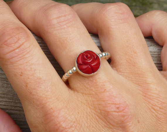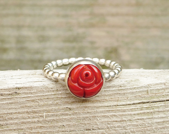 Deze zilveren ring is voorzien van een koraal steen in de vorm van een bloem.